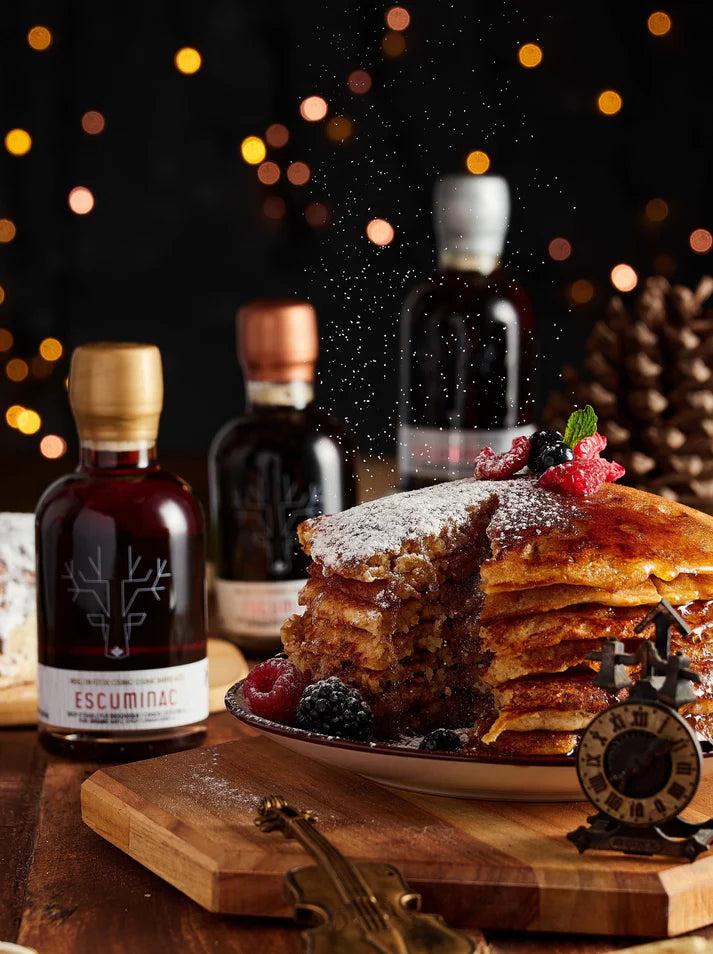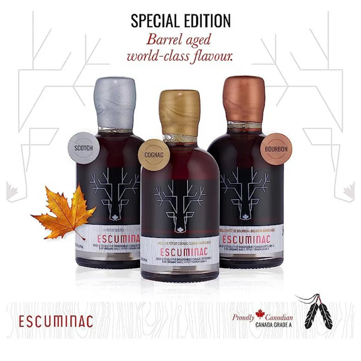 סירופי מייפל Escuminac Bourbon Barrel Aged – אורגני, דרגה A, ממקור יער יחיד, 100% טהור, ללא תוספים, חומרים משמרים או טעמים מלאכותיים. כל בקבוק מעניק שילוב מושלם של טעמי המשקאות עם המייפל.