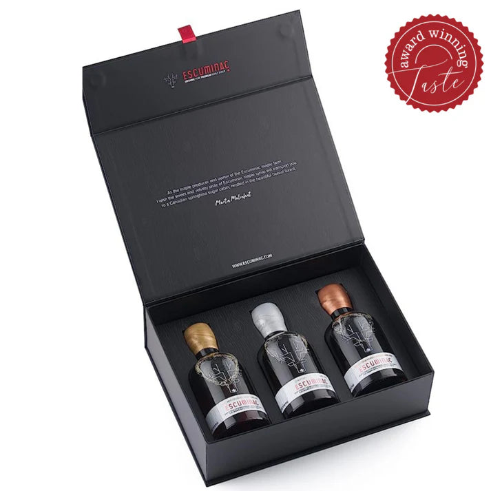 אוסף יוקרתי וייחודי מציע שלושה סירופי מייפל מיושנים בחביות שיכר - כל אחד מהם ספוג בחתימת הטעם הייחודית של החבית שבה התבגר. חביות קוניאק , סקוץ' ובורבון מעניקות עומק, עושר וטעמים מורכבים שקשה לפספס. מתנה וואו לחברים טובים במיוחד!