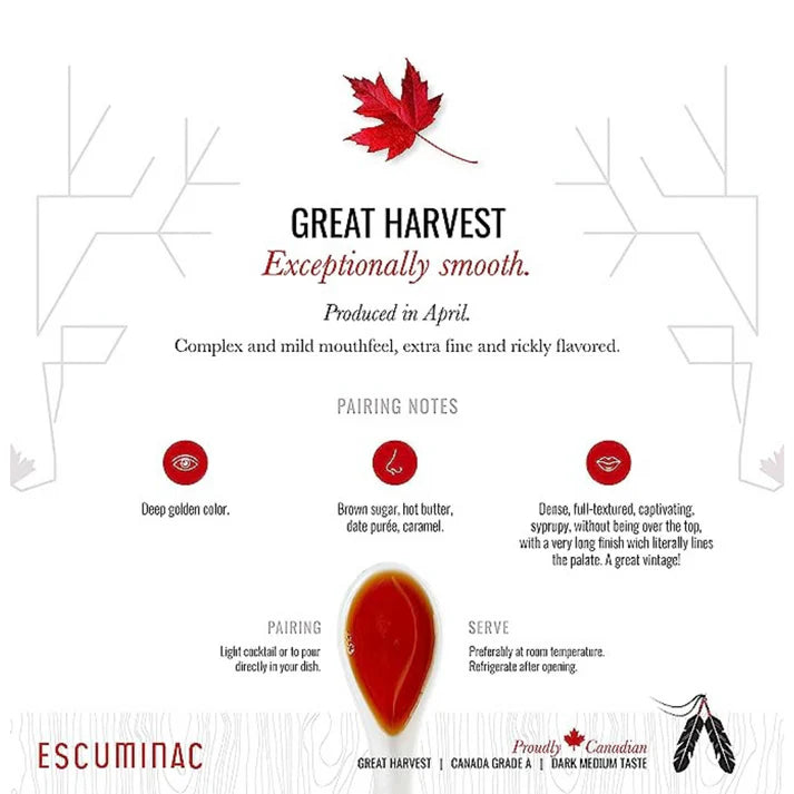 סירופ הקציר המרכזי של Escuminac הוא הסירופ הפופולרי ביותר בקו – הן בזכות הזמינות והן בזכות האיזון המדויק בין עומק, מורכבות וקלילות. זהו סירופ מייפל אורגני דרגה A מקנדה, עדין במיוחד אך עשיר בטעמים. המרקם עגול ונעים בפה, עם תחושה סירופית מובחנת שאינה מכבידה.